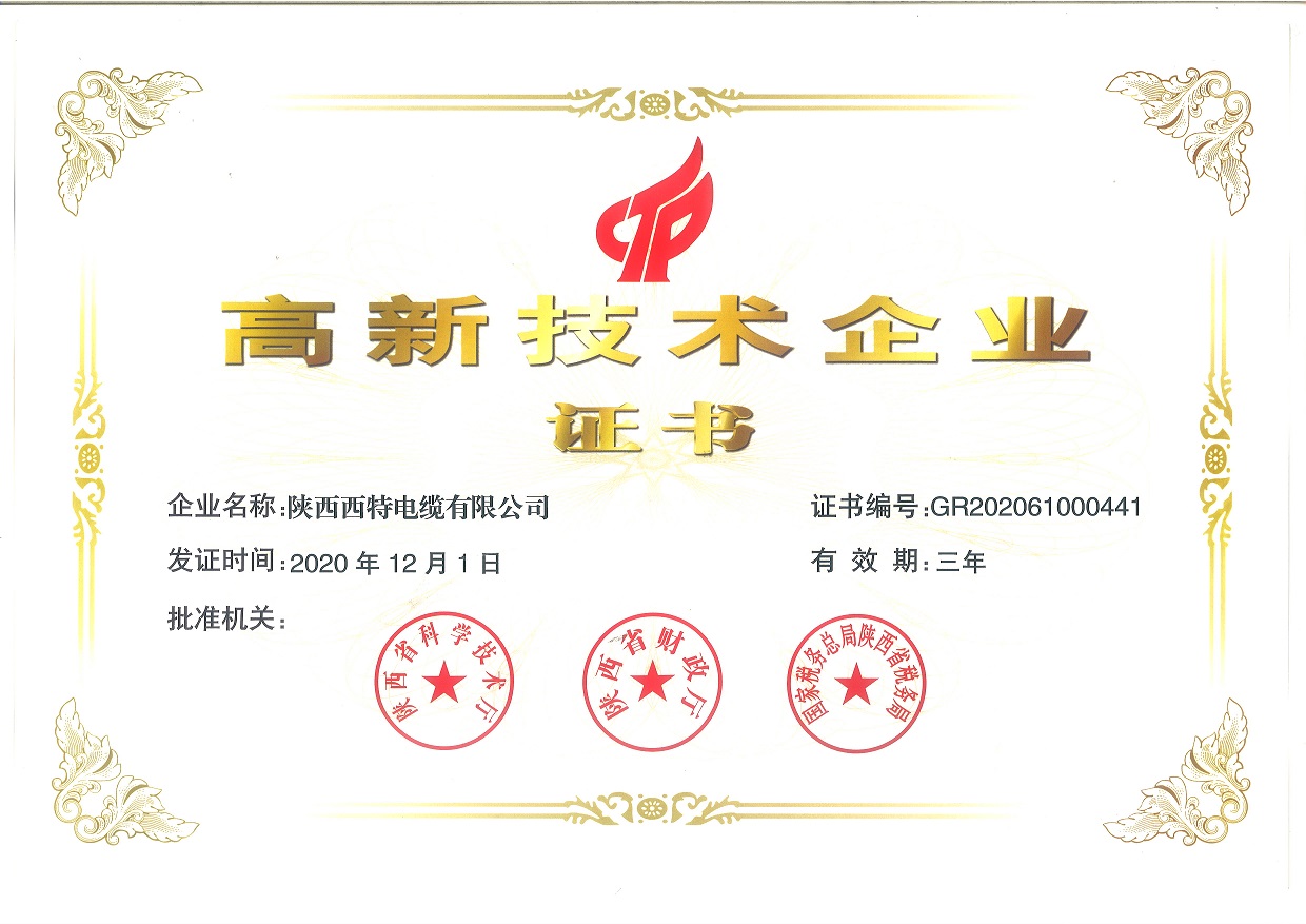 陜西西特電纜有限公司收到由陜西省科學(xué)技術(shù)廳、陜西省財(cái)政廳、國(guó)家稅務(wù)總局陜西省稅務(wù)局聯(lián)合頒發(fā)的《高新技術(shù)企業(yè)證書》榮譽(yù)稱號(hào)